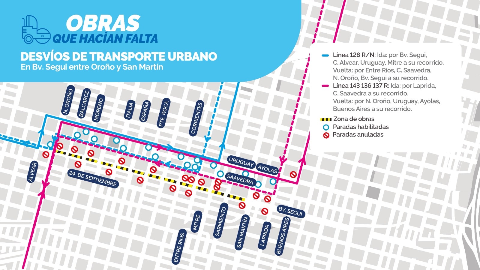 Por el inicio de obras de repavimentación de Bv. Seguí entre Bv. Oroño y Av. San Martín, se están llevando adelante cortes de tránsito y diferentes líneas de transporte urbano que circulan por el sector están modificando parcialmente sus recorridos así como sus paradas habituales. Estos cambios se mantendrán hasta la finalización de los trabajos.